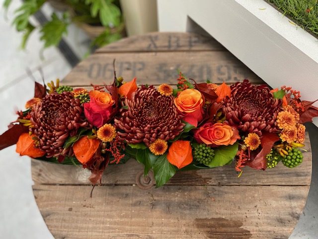 / Langwerpige decotable met bolchrysanten